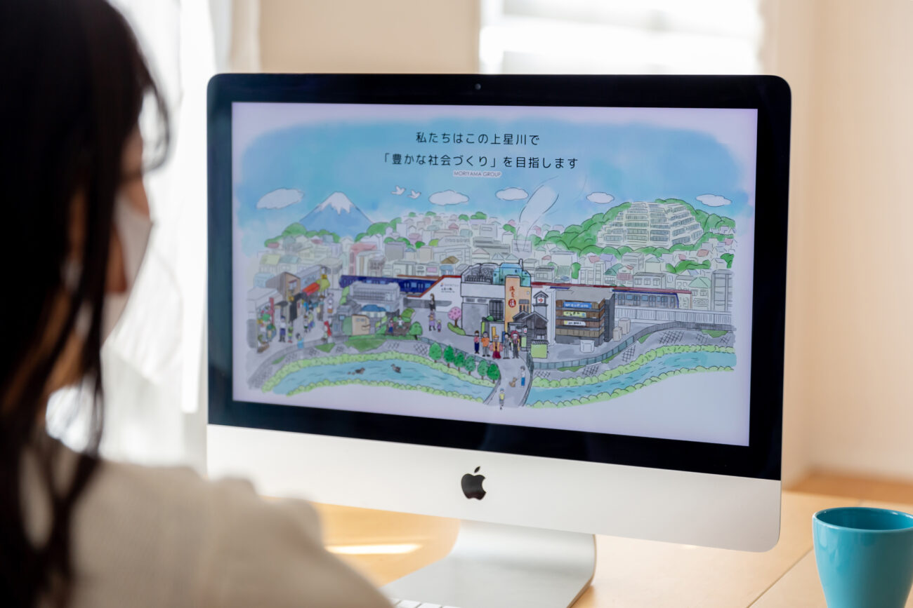 神奈川県横浜市にある「株式会社モリヤマ」様のホームページ制作をお手伝いしました。メインビジュアルなどイラストも担当しています。本社がある上星川駅周辺の風景イラストにアニメーションをつけ、動きのあるメインビジュアルとなりました。また、会社案内も同様のイラストを使用しデザイン制作しています。