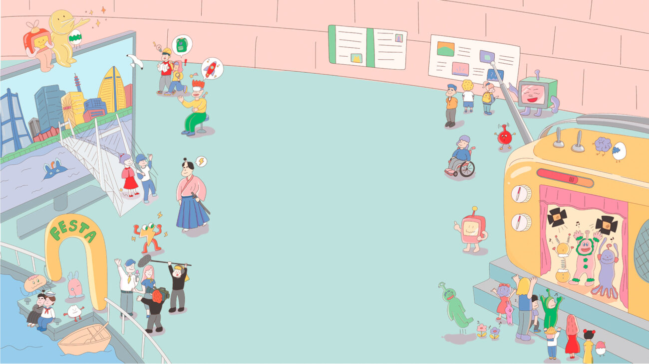 横浜や放送の要素、イベントのコンテンツなどをユニークなキャラクターに落とし込みイベントの賑やかさを表現しました。
