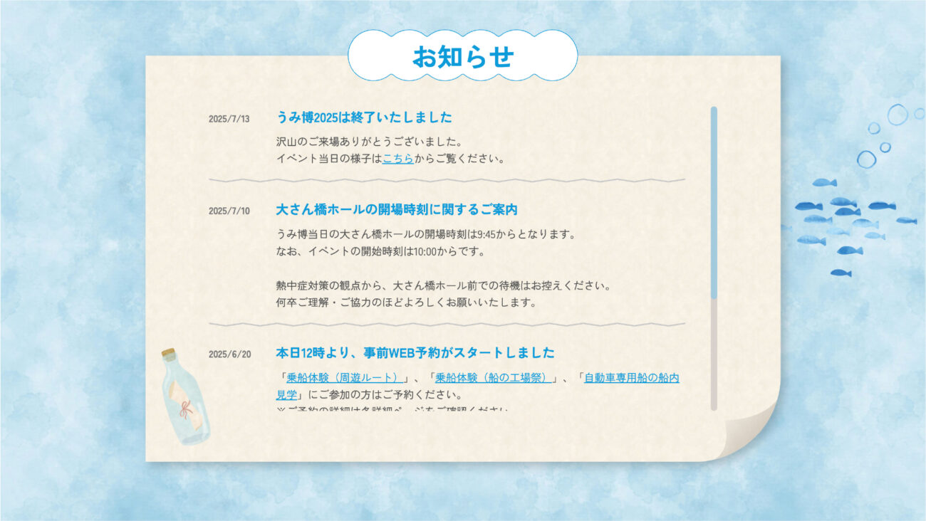 海をテーマにした子ども向けイベント「海洋都市横浜うみ博2025」のホームページ制作を担当させていただきました。 海や横浜のモチーフを散りばめ、親しみやすい世界観を意識。 「楽しさが伝わるデザイン」と「迷わず情報を得られる構成」の両立を心がけています。