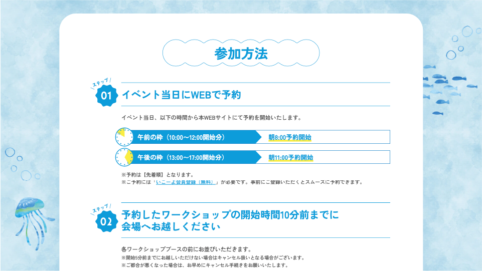 イベントのコンテンツごとに参加方法が異なり、予約サイトも複数に分かれていたため、分かりやすく整理して明記しました。