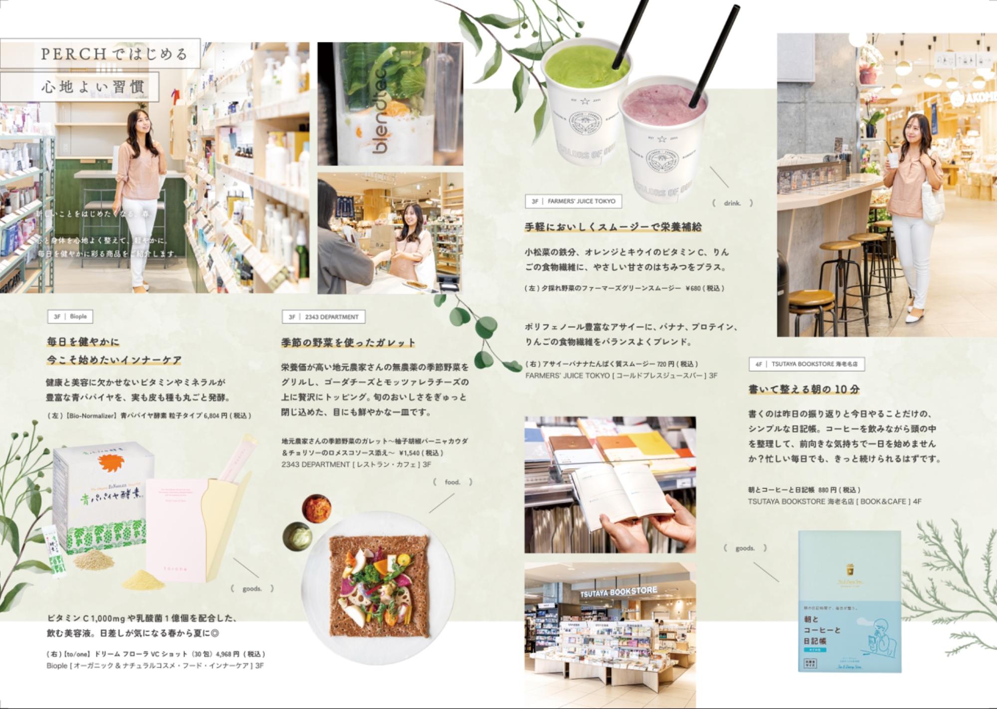 企画の軸となるテーマを「朝・昼・夜で楽しむ、PERCHの過ごし方」と「PERCHではじめる、心地よい習慣」の2案に絞り込み、各店舗をどちらの企画で訴求するかを検討。前者は時間帯ごとの使い方・過ごし方を提案する構成、後者は毎日の生活を健やかにするアイテムや飲食物を紹介する構成です。各店舗へのアンケートをもとに掲載商品を決定し、企画の方向性を固めました。