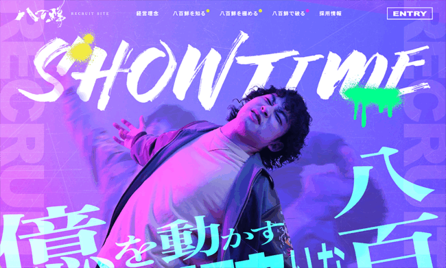 株式会社八百鮮では、「八百屋」のイメージを覆す、まるで映画の予告編のようなスタイリッシュな動画を採用サイトのトップに掲載。社員がイキイキと働く姿や仕事への誇りを伝えることで、「面白そう!」「ここで働いてみたい!」という若者の心を掴み、多くの新卒採用に成功しています。
