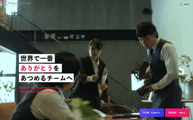 株式会社アスカフューネラルサプライが属する葬祭業が一般的に持たれてしまうイメージを打破し、「堅いイメージを感じさせないデザイン」や「活き活きと働くとは何か?」という動画を上手く活用し、独自の魅力を伝えるという明確な戦略を打ち出しています。求職者が「共感・安心・信頼」を得られる場を採用サイトとして提供しています。