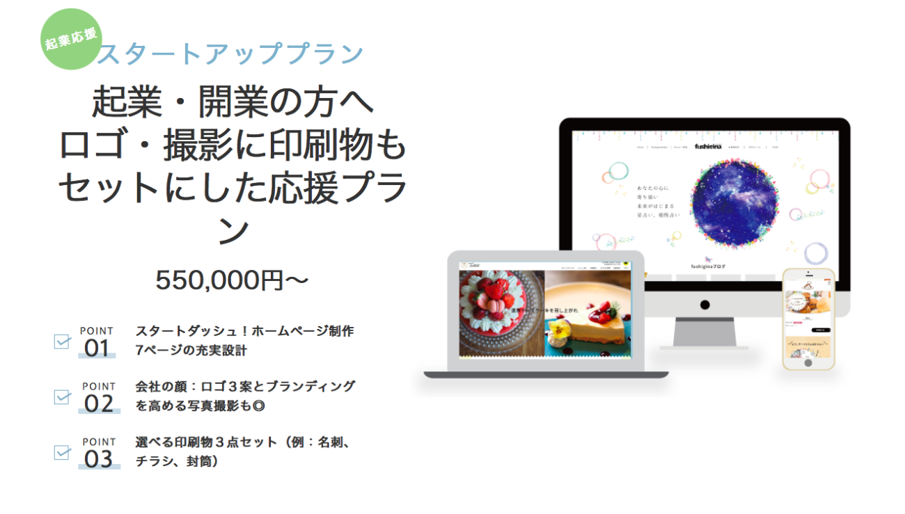 当社では、起業・開業の方へホームページ作成・ロゴ・撮影に印刷物もセットにした応援プランをご用意しております。