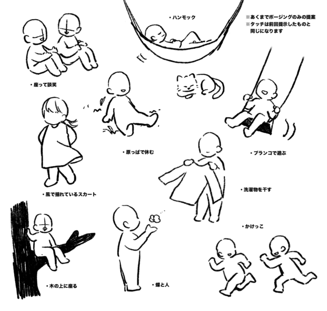 コンセプトで検討したポージングを、ラフとして具現化していきます。
