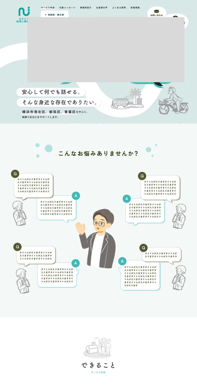 堅いイメージを持たれがちな「税理士」をやわらかく表現するため、イラストを取り入れたり、曲線を用いたデザインを採用しました。