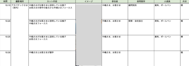 撮影時に参照する資料でもあるため、ポーズや参加者、使用箇所、必要な物品など、必要な情報はすべて反映します。